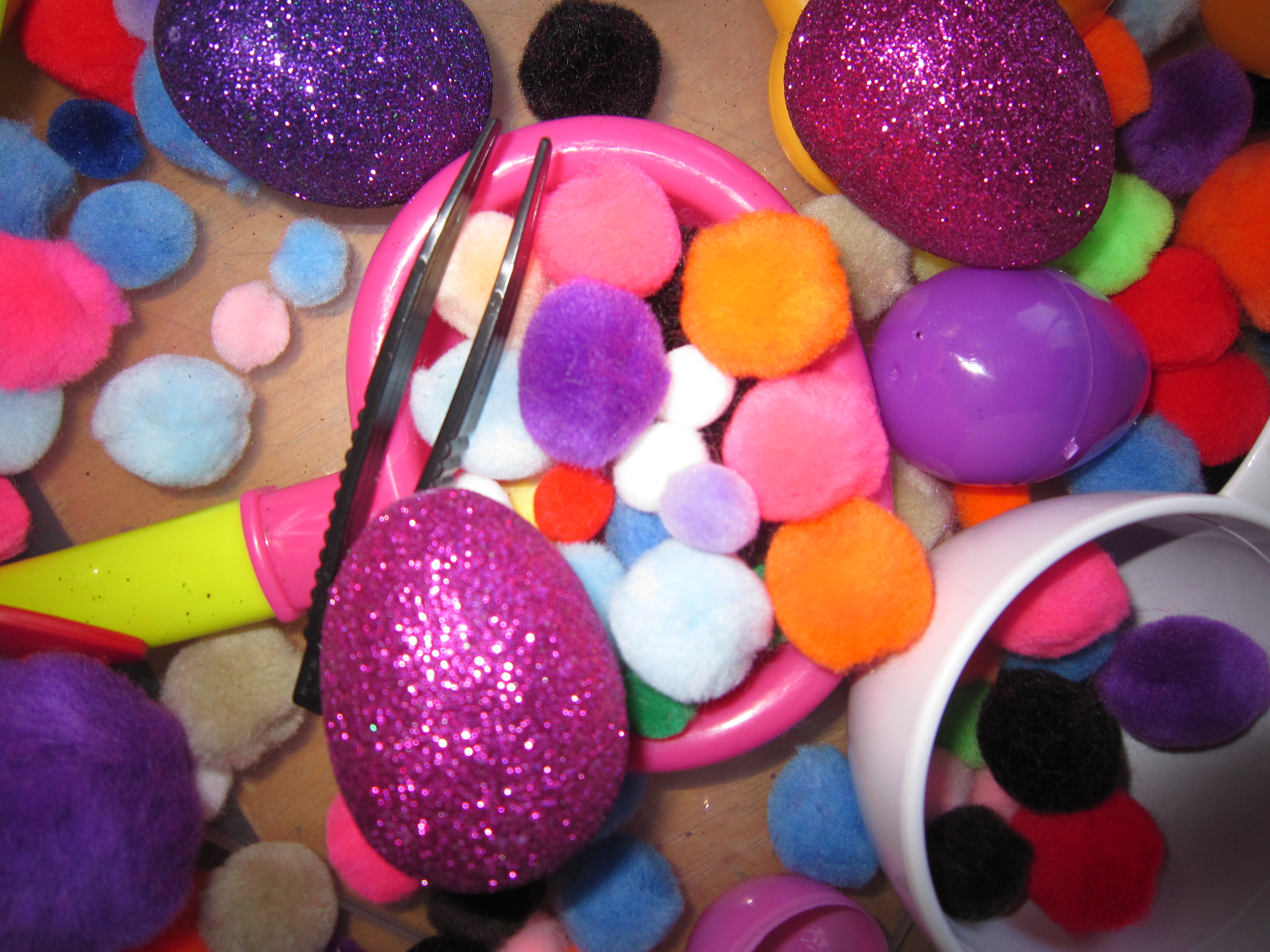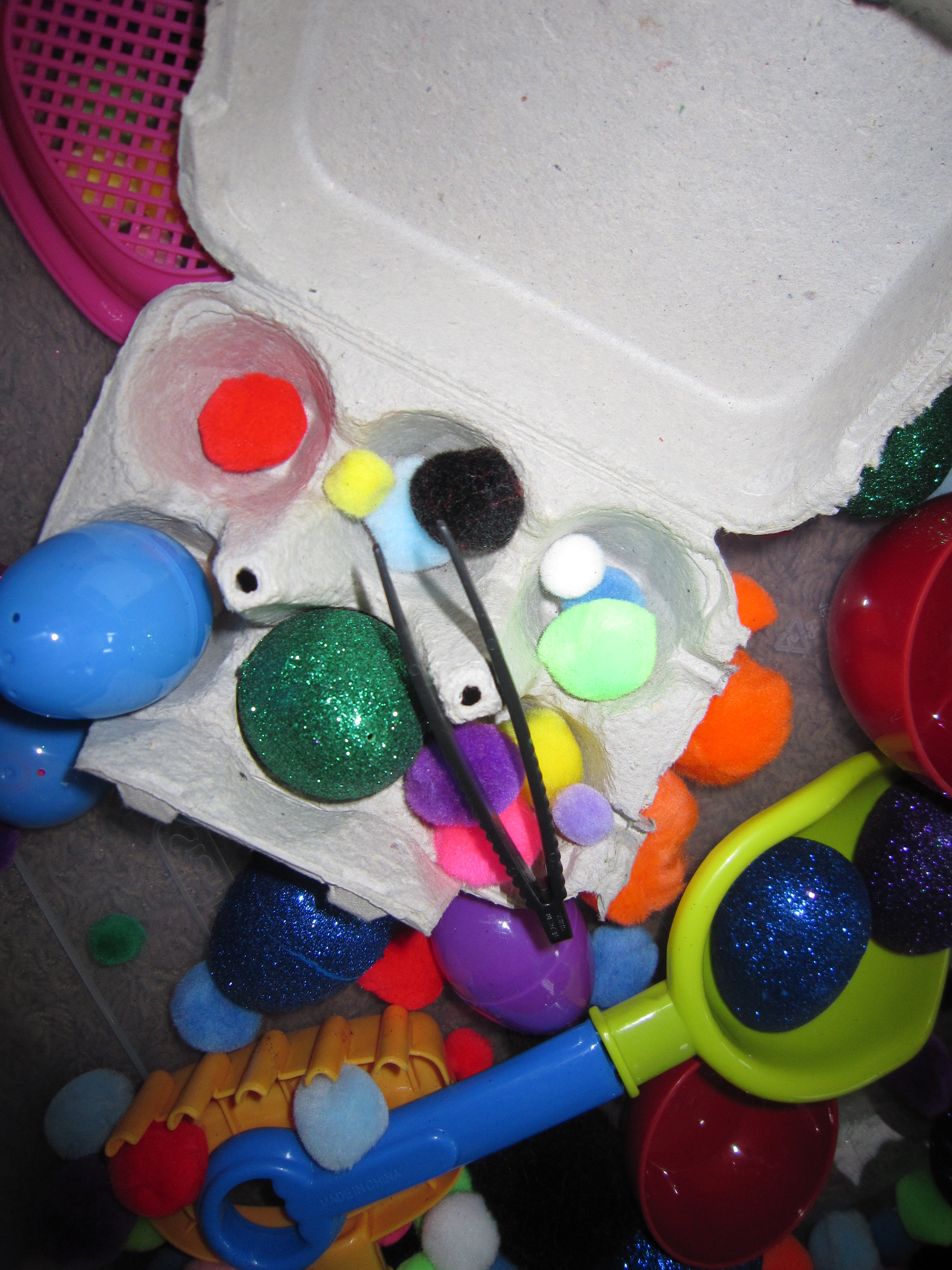 One of the kids favorite things that they see me pull out from the cupboard is our sensory bin. This morning new materials were added to our bin. Items inclused plastic eggs, pom poms, tweezers, egg cartons and various scooping tools (measuring cups, spoons, etc). Before I brought out these materials I had no plan on setting them out today, in fact this was going to be for our Easter week but at circle time all the kids wanted to talk about was the Easter bunny and how he hides eggs. After we had sharing time I told the kiddos they were free to go play. I went and put this bin together and when I brought it out they were SO excited that there were eggs in there! The pom poms and other things were just a bonus. They started by filling the eggs with the pom poms. The older two matched the color poms with the same color egg (on there own), and all of them had fun trying to pick pom poms up with the tweezers (working their find motor muscles!). Opening and closing the eggs is also great at working those small muscles in there hands. They used the egg cartons to load up there eggs and started counting how many eggs fit into each carton, also counting how many extras they could squeeze in even though there wasn’t a designated spot for the extras. I mentioned to them that each carton holds a half dozen eggs….they stopped, looked at me and ‘B’ Says “well then a half dozen is 6 because this carton is holding 6 of my eggs” I was SOOO excited that he put that together! I then told them that 2 of the cartons together would be 1 dozen eggs. Not long after that “B” came back up to me and said “one dozen is 12!” He was so excited and so was I! He figured it out on his own just by me mentioning the word 1/2 dozen and 1 dozen. Soon all the kiddos were counting out a dozen eggs 🙂