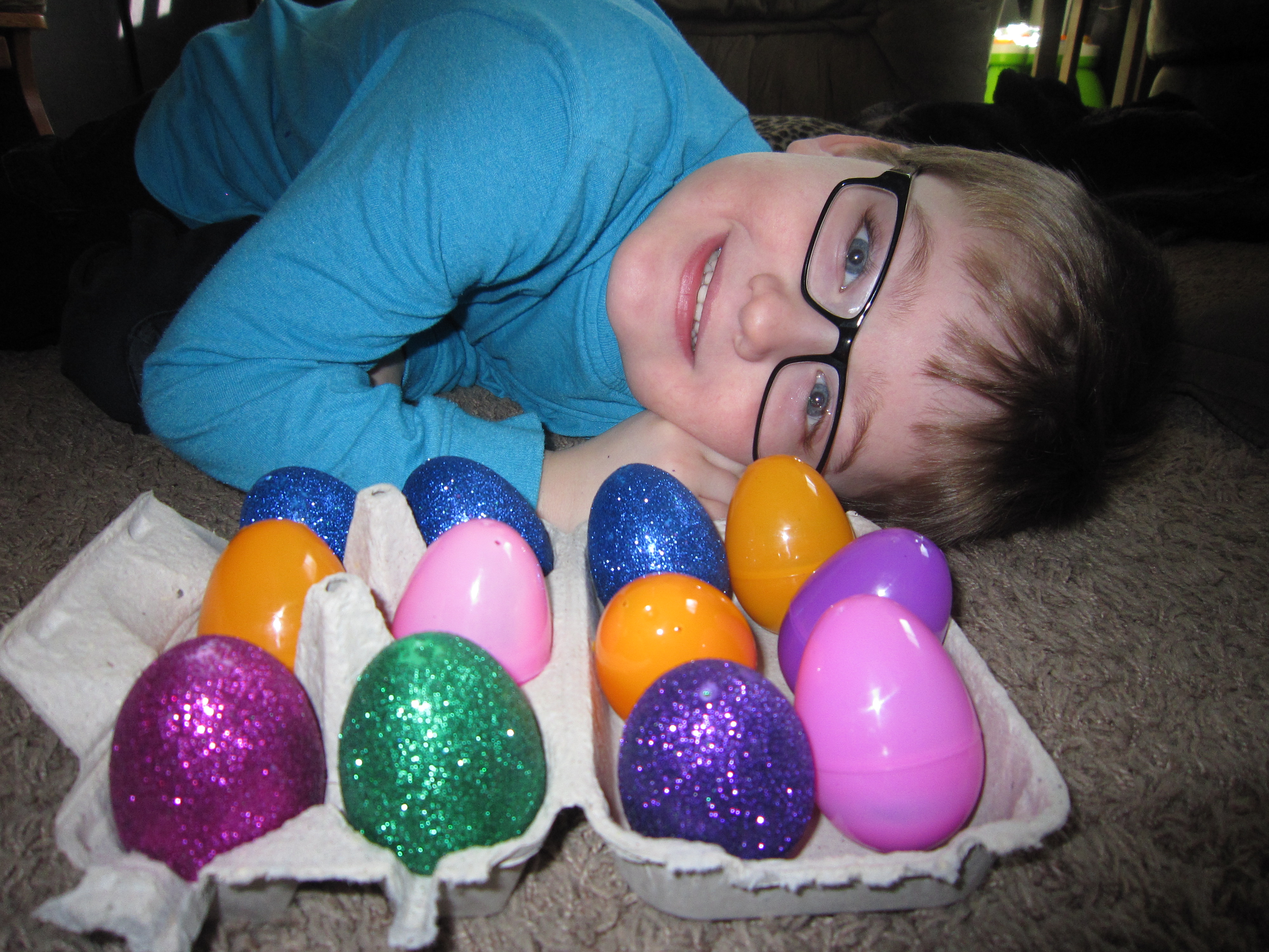 About 45 minutes into their playing they decided they wanted to hide the eggs like the Easter bunny does. They gathered 6 eggs and hid them around the house. At this point I was getting lunch around and one of the kiddos comes to the kitchen and says “Sis hid 6 eggs and we found 4 of them…how many more do we need to find?” My first thought was “This 5 year old just asked me a story math problem!” I said to him “let’s figure this out together” We all sat down (by that point all the kids were in there with us waiting to see how many more eggs they needed to find) and held up 6 fingers. I repeated what he had asked me and we put 4 of our fingers down and they counted how many that should be left to find. 2!!!! they all screamed! We need 2 more eggs! They all ran out of the kitchen excited to find those 2 eggs. I was excited that we just “worked” on so much math in the hour with that sensory bin! Did they know they were doing math? No! But with them just playing and having fun there were learning and SO excited to be doing so!