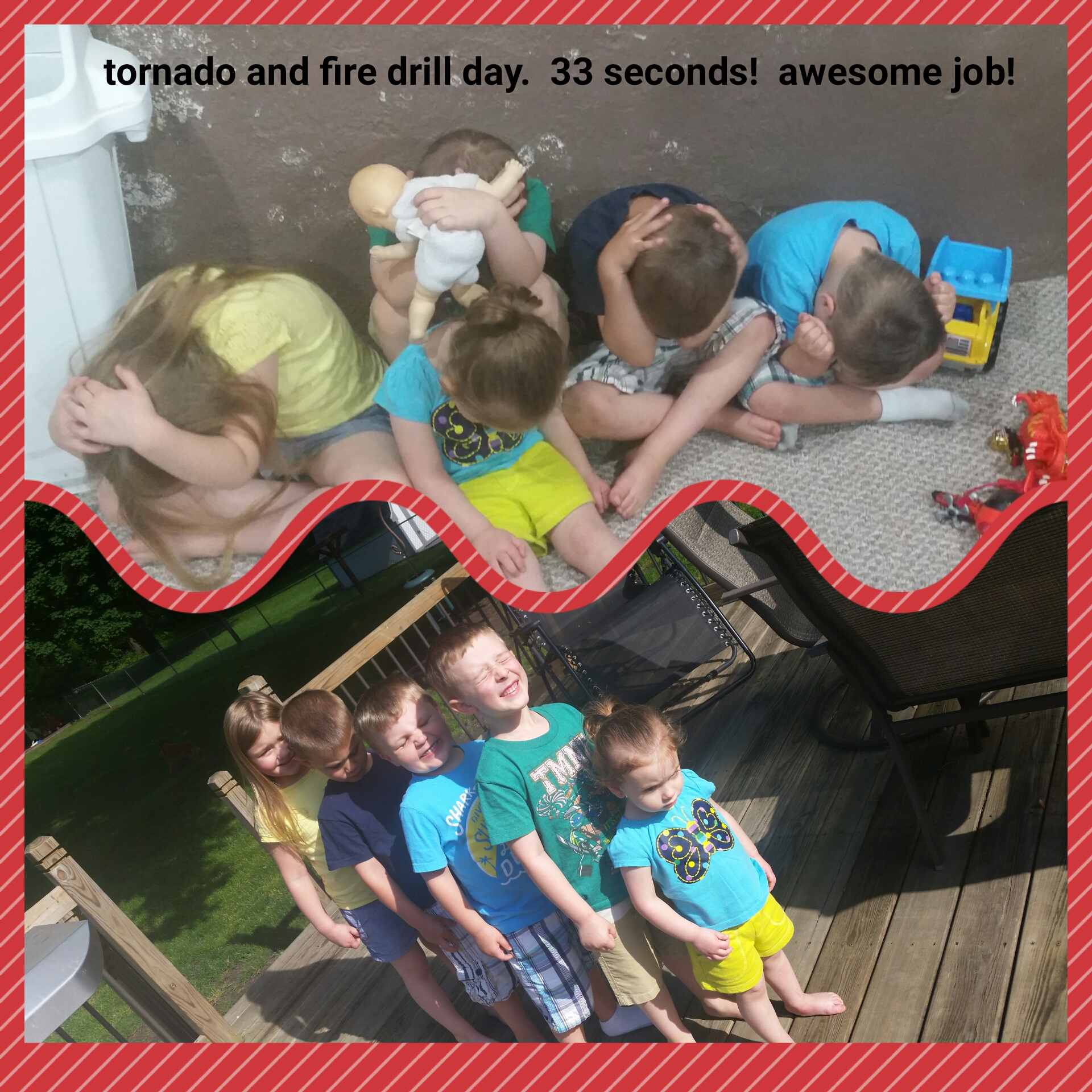 So proud of my little angles. We do fire drills monthly and tornado drills April – October and they all do so amazing. I don’t tell them when, or that I’m going to set off the alarm, but the older kids that have been here for awhile know exactly what to do. They don’t question why (until after usually) they just follow our exit plan. Here’s a picture of them lining up after our drill and protecting their “noodles” (heads) in the basement.