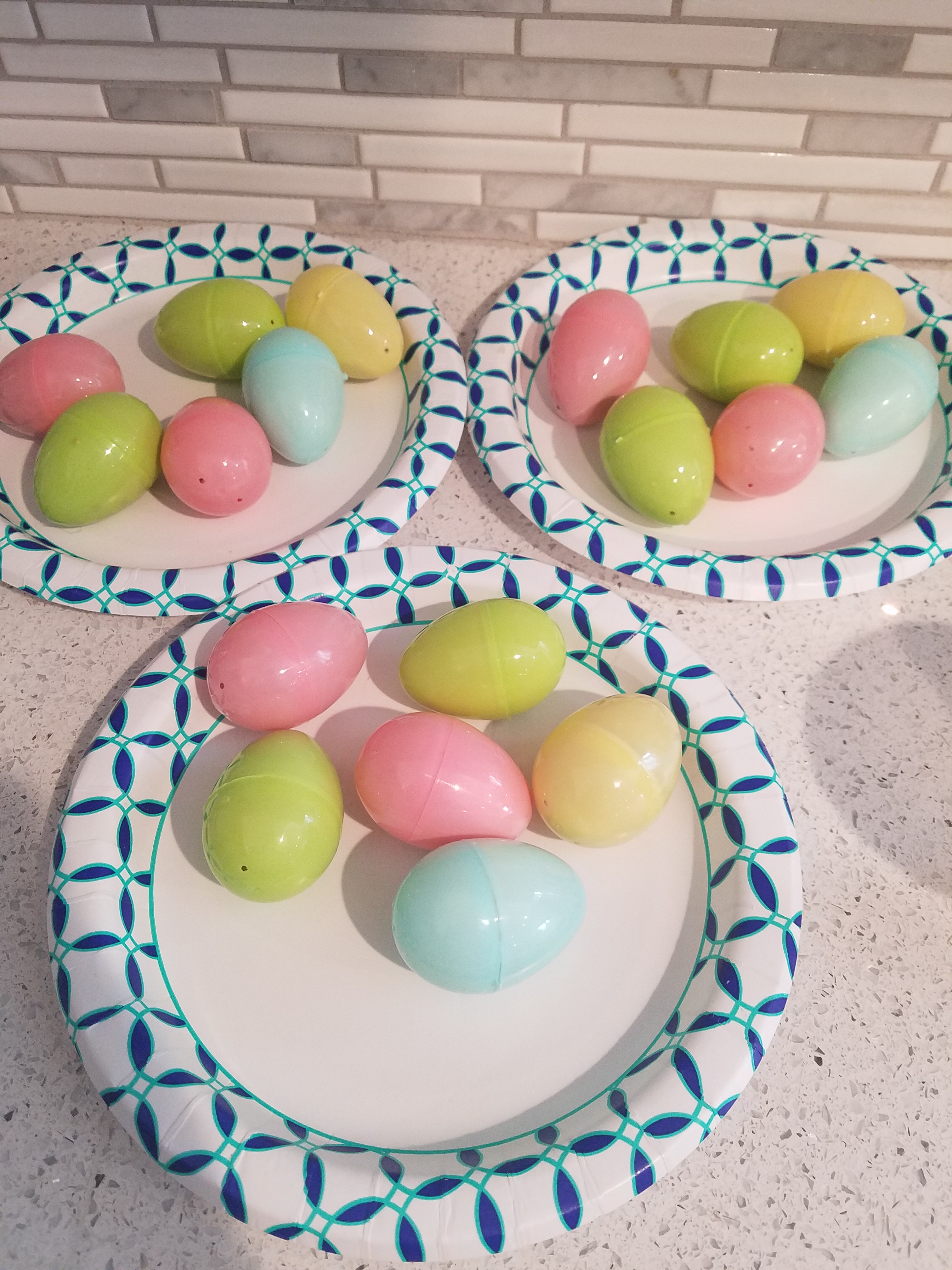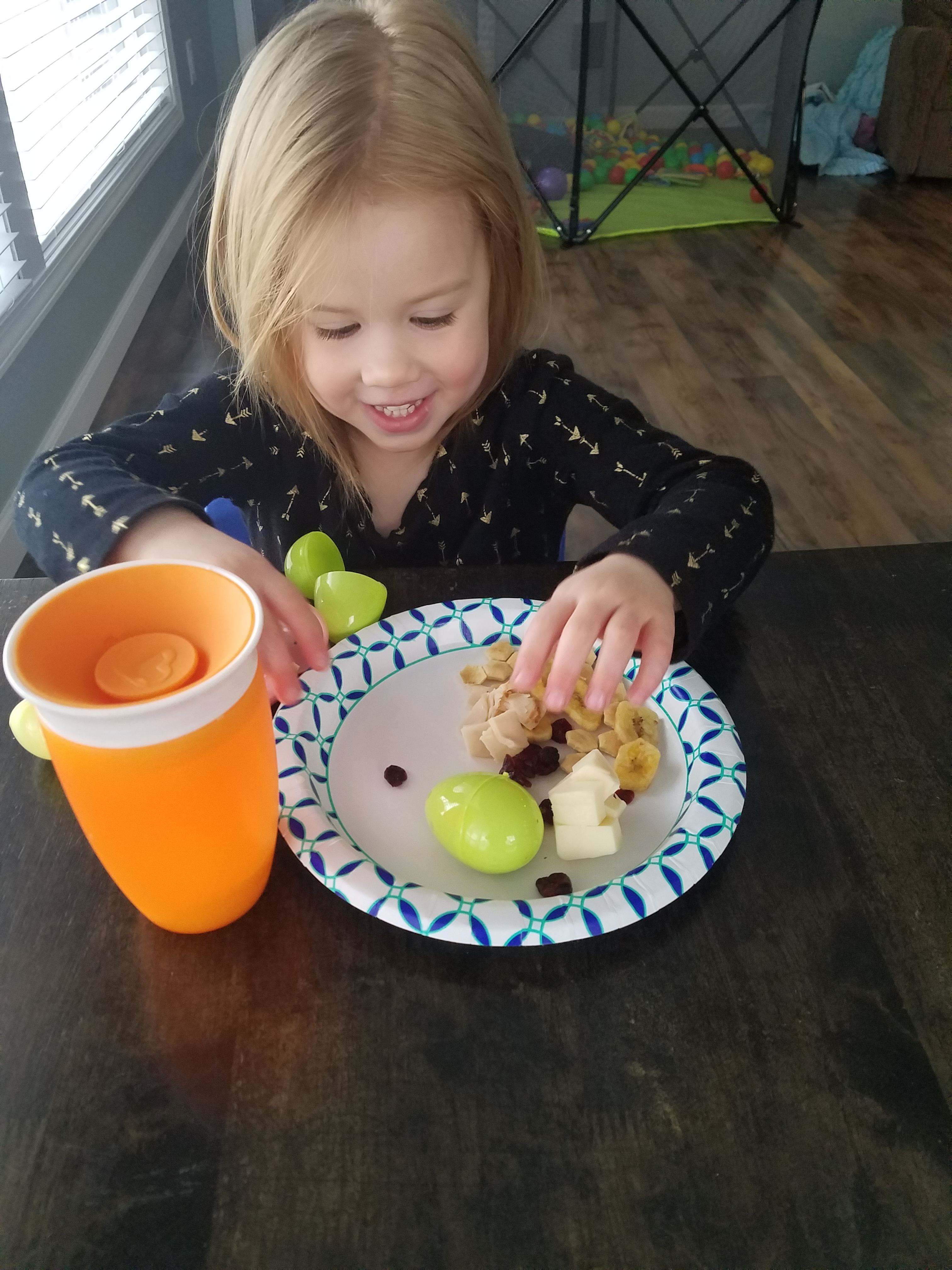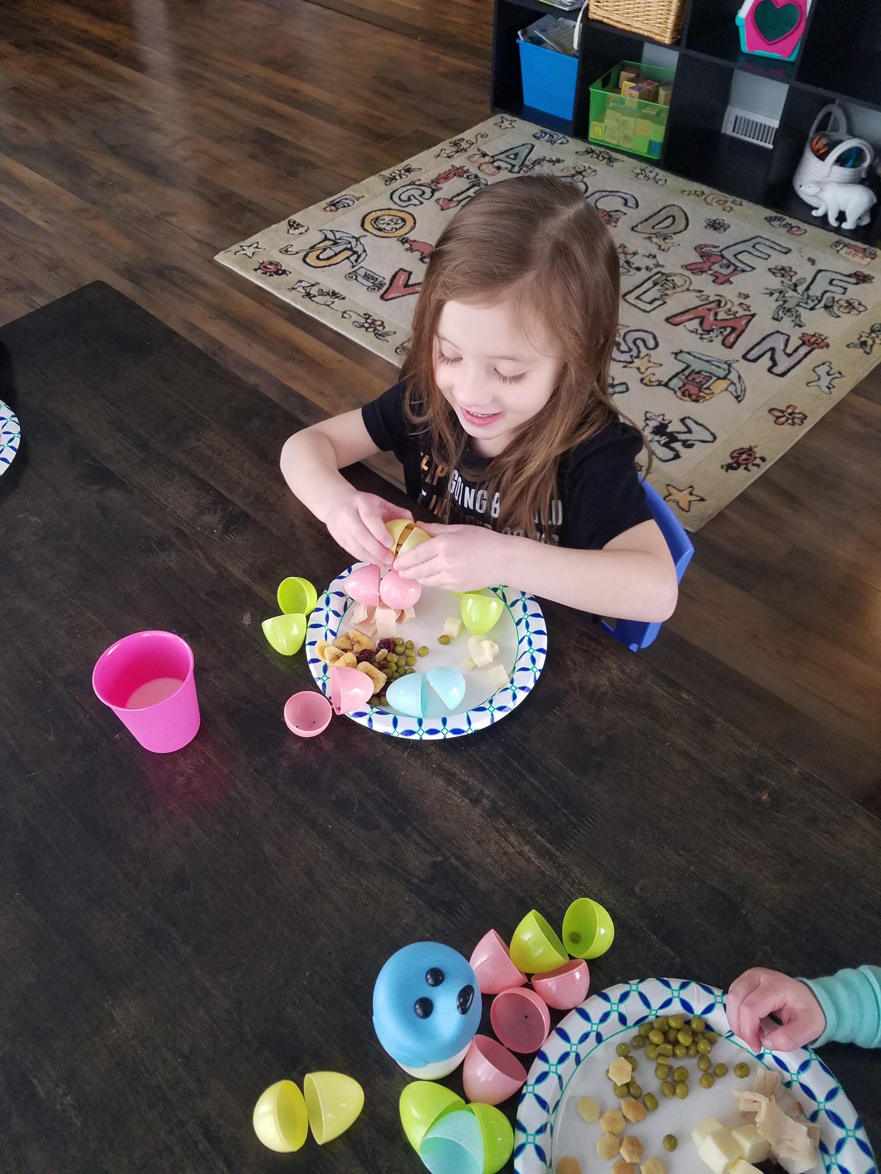 Each egg is stuffed with yummy goodness and they can’t wait to “crack” each one open and find what’s inside. This year we did, Turkey breast, cheese cubes, dried cranberries, oyster crackers, banana chips and peas.